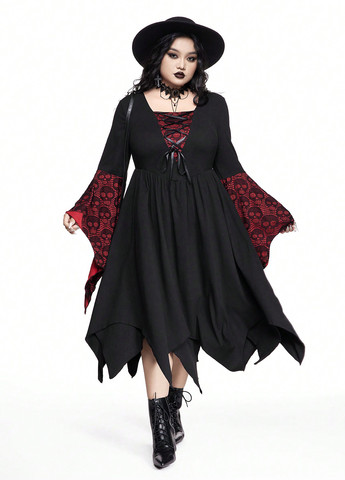 Платье ROMWE Goth Plus Size. Это платье-миди с квадратным вырезом и асимметричным подолом. Изготовлено из трикотажного полотна средней эластичности. Подходит для вечерних мероприятий и фестивалей, таких как Хэллоуин.