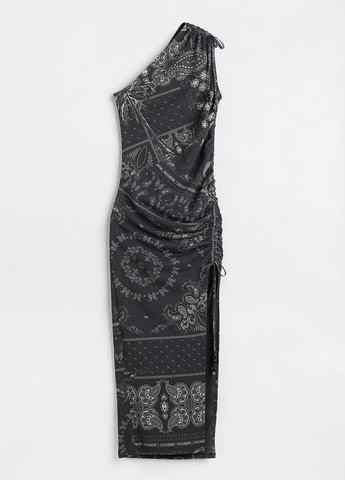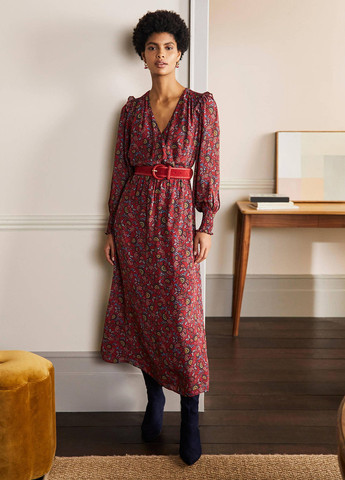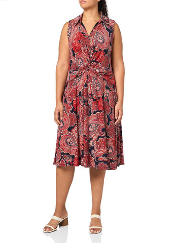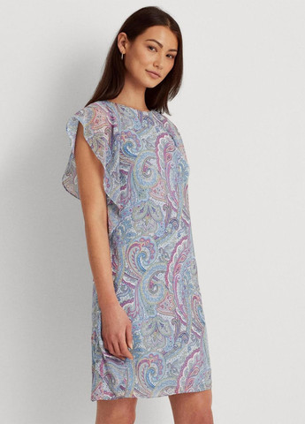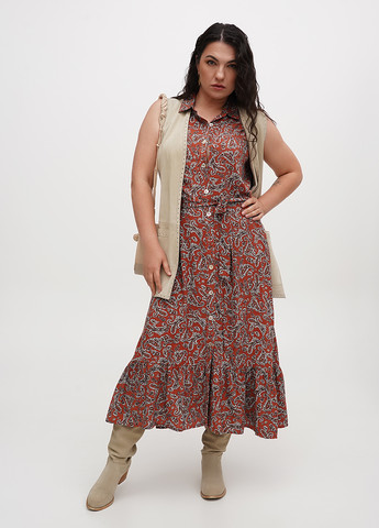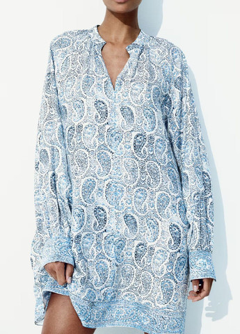 Платье изготовлено из штапельной ткани, которая имеет абстрактный принт и гладкую фактуру. Ткань имеет минимальную растяжимость, учитывайте это при подборе размера. Благодаря своей длине и фасону хорошо садится по фигуре. Платье с короткими рукавами, которые украшены кружевом. Плечевой шов находится на естественной линии плеча. Платье имеет круглый вырез горловины. Модель дополнена разрезами по бокам подола и кулиской по талии. Также присутствуют боковые карманы в шве.