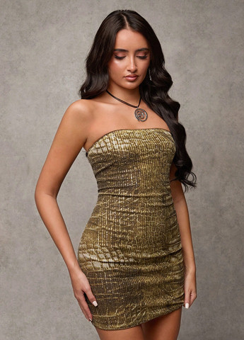SHEIN представляет мини-платье без бретелек. Оно имеет приталенный крой и низ-карандаш. Ткань слегка эластичная.