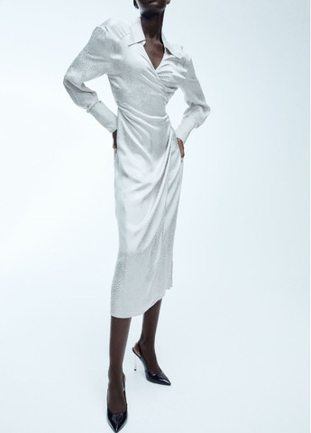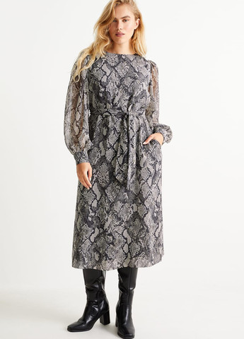 Платье длиной до щиколотки из воздушной ткани с рисунком змеиной кожи, драпированной передней частью и декоративной накидкой наверху. Длинные рукава шириной, обеспечивающей асимметричный вид, драпируются вшитой накидкой сзади, швом на талии и драпированной юбкой с разрезом спереди. Потайная молния с одной стороны. Юбка на подкладке. Возможно повреждение бирки