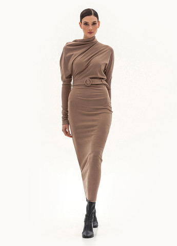 Вид изделия: трикотажное платье с асимметричным кроем в верхней части и съёмным ремешком на пряжке. Силуэт: полуприлегающий, прямой. Посадка по талии: классическая. Материал: трикотаж средней плотности. Застёжка: отсутствует. Подкладка: отсутствует. Карманы: отсутствуют. Вырез горловины: асимметричный, хомут. Рукав: полуреглан. Измерения изделия: Длина изделия: 40 — 161 см, 42 — 161 см, 44 — 162 см, 46 — 163 см, 48 — 163 см, 50 — 164 см, 52 — 164 см. Уход за изделием: деликатная, быстрая ручная стирка при 30° без агрессивных моющих средств. Параметры модели: рост 179 см, ОГ 89 см, ОТ 60 см, ОБ 89 см. Размер на модели: 40 UA.
