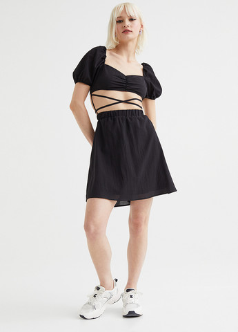 Платье-двойка с укороченным верхом и юбкой из хлопковой ткани. Короткие рукава-фонариками, резинка на плечах и рукавах . Декоративные завязки которые перекрещиваются спереди и застегиваются сзади. Слегка расклешенная юбка с потайной резинкой на талии. Частично на подкладке. Длина изделия по спинке на размер S : 80 см, окружность груди: 78 см, окружность талии: 68 см, на размер М : 85 см, окружность груди: 82 см, окружность талии: 80 см.