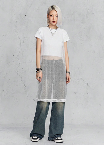 Повседневное платье в сетку без рукавов с простым белым дизайном. Изготовлен из трикотажной ткани с небольшой эластичностью, имеет натуральную линию талии и прямой низ. Круглый вырез обеспечивает привлекательный силуэт, а свободный крой обеспечивает комфорт. Это платье до колена идеально подходит для летней одежды и создает сексуальный повседневный стиль.