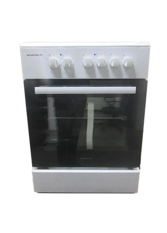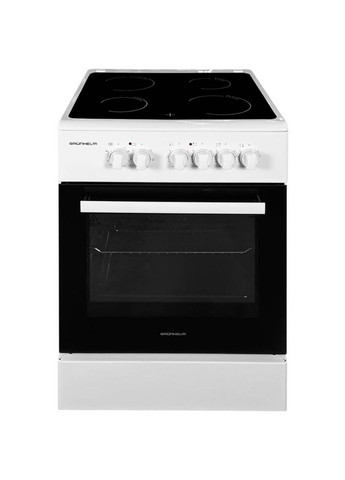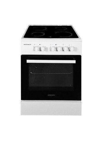 Отдельно стоящая плита электрическая 4 камфорки с электро-духовкой Grunhelm FEG661W Двойное стекло на дверцах духовки Возможность снятия внутреннего стекла Регулировка ножек Подсветка духовки 15 Вт Верхняя плита 4 камфорки: 2 камфорки мощностью -1 000Вт 2 камфорки мощностью -1 тен – 1 200 Вт, Верхний тен – 1 000 Вт