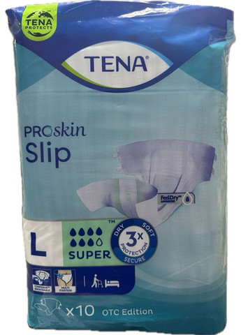 Подгузники размер L SUPER степень поглощения 7 капель (на объем талии 90-145 см). В упаковке 10 шт. Степень поглощения: тяжелое недержание. Подгузники для взрослых Tena – это универсальные средства защиты при недержании, которые обеспечивают тройную защиту для сухости, мягкости и предотвращения протечек. Особенности: технология FeelDry Advanced обеспечивает мгновенное впитывание жидкости; высокоабсорбирующая сердцевина из SAP: обеспечивает удержание больших объемов жидкости; система нейтрализации запаха Odour Neutralizer; дышащие материалы: применение технологии ConfioAir; двойные гидрофобные барьеры; широкие многоразовые застежки; индикатор наполнения; дерматологически протестированы.