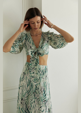 Стильный костюм, состоящий из топа и юбки. Топ с удобным рукавом три четверти на резинке, которую можно завязать как спереди, так и сзади. Юбка с эффектной расклешенной формой на змейке и оборкой внизу придаст женственности.
