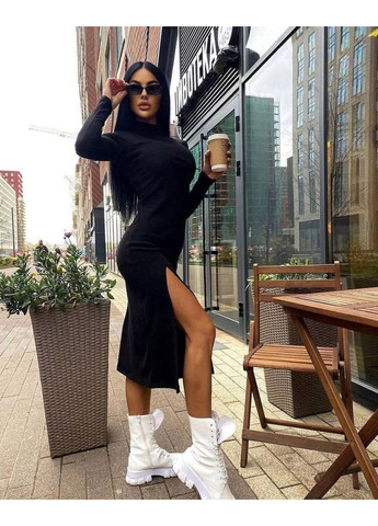 Женское платье с длинным рукавом – стильная и элегантная модель для современного гардероба. Платье выполнено в приталенном крое, подчеркивающем фигуру, а мягкая эластичная ткань обеспечивает комфорт и свободу движений. Особенностью модели является высокий разрез сбоку, придающий образу женственности и легкому шарму. Длинный рукав и закрытый верх с круглым вырезом горловины создают баланс между сдержанностью и сексуальностью. Длина меди делает платье универсальным – его можно носить как в повседневной жизни, так и на вечерние выходы. Она гармонично сочетается как с массивными ботинками или кроссовками для городского стиля, так и с элегантными каблуками для более праздничных образов.