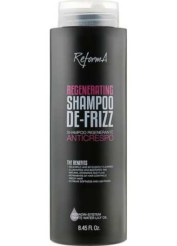 Британский бренд ReformA уверенно и вдохновенно покоряет пьедесталы красоты и стиля, даря девушкам со всего мира возможность сверкать здоровыми, ухоженными и послушными укладками, невзирая на активный ритм жизни и постоянную занятость. На этот раз известный производитель удивил своих поклонниц выпрямительным и регенерирующим шампунем. Regenerating Shampoo De-Frizz обеспечивает эффективное обновление поврежденных прядей, одновременно избавляя их от пушистости и мелких несовершенств, спровоцированных агрессивным воздействием внешних и внутренних факторов. Особенности Regenerating Shampoo De-Frizz бренда ReformA: - изготовлен специально для деликатной очистки волнистых и вьющихся волос; - обеспечивает качественное восстановление его поврежденных участков; - способствует эффективному заполнению структурных «пробелов»; - делает пряди более гладкими, упругими и шелковистыми; отлично освежает и тонизирует кожу головы; - отличается качественными успокаивающими свойствами; - активно борется с зудом, другими дискомфортными ощущениями; - значительно уменьшает пушистость прядей, разглаживая чешуйки; - предотвращает появление сухости, ломкости, секущихся кончиков.