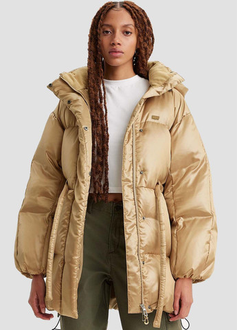 Стеганый зимний пуховик с регулируемой талией и капюшоном.