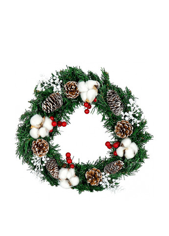 Новогодний венок Шишки 35 см. Новогодний венок станет отличным интерьерным украшением на новогодние праздники. Украшен шишками, хлопком и ягодами (красными и белыми). Можно подарить при походе в гости. Размер: 35 см. Материал: ПВХ. Упаковка: Пакет.