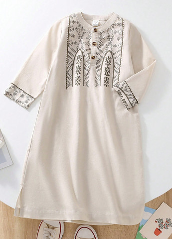 Детская рубашка-вышиванка с длинным рукавом. Вышивка машинная по ткани. Спинка однотонная. Горловина на завязке. Замеры на 110 размер (104 рост): ОГ по изделию - 67 см (плюс 4 см на каждый следующий размер); рукав - 39 см (плюс 2,5 см на размер); длина - 42,5 см (плюс 2,5 см на размер). Для 164 размера - рукав 62 см, ОГ по изделию - 105 см, длина по спинке - 71 см. Для 170 размера - рукав 65 см, ОГ по изделию - 109 см, длина по спинке - 74 см.