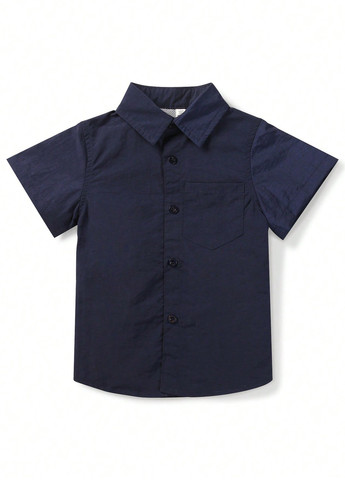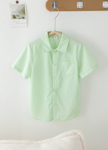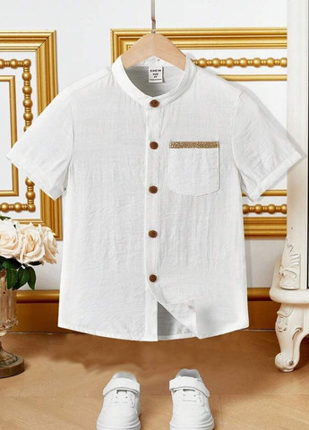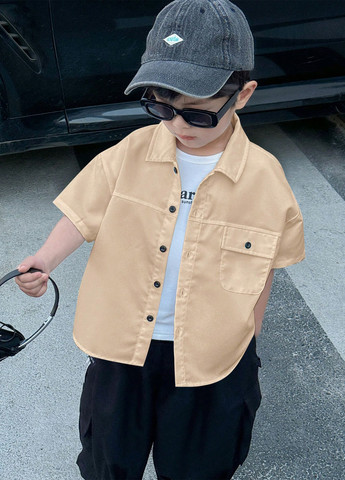 Повседневная рубашка SHEIN Young Boys. Эта повседневная рубашка предназначена для мальчиков. Свободный крой и стандартная длина. Короткие рукава и воротник-стойка. Нашивки и карманы. Инструкции по уходу: машинная стирка или химчистка.