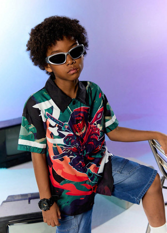 Повседневная джинсовая рубашка для мальчика с принтом героев. Рубашка стандартного кроя с воротником и короткими рукавами. Изготовлена из слегка эластичной ткани, без карманов и стандартной длины.