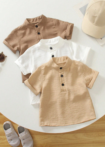 Этот комплект включает три рубашки для мальчиков. Они имеют воротник-стойку и короткие рукава. Рубашки имеют простой, однотонный крой. Ткань – 100% полиэстер, слегка тянется. Застёжка на пуговицы спереди. Рекомендуется машинная стирка.