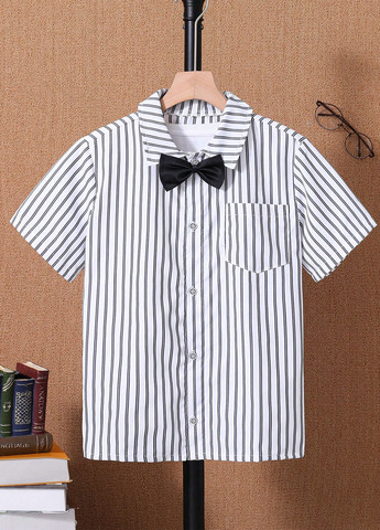 Модная полосатая рубашка для подростков Tween Boy. Эта рубашка с короткими рукавами имеет вертикальный полосатый дизайн. Она имеет стандартный крой и воротник-стойку. Рубашка включает бант, карман и застежку на пуговицы спереди. Ткань не тянется. Это однобортный фасон.