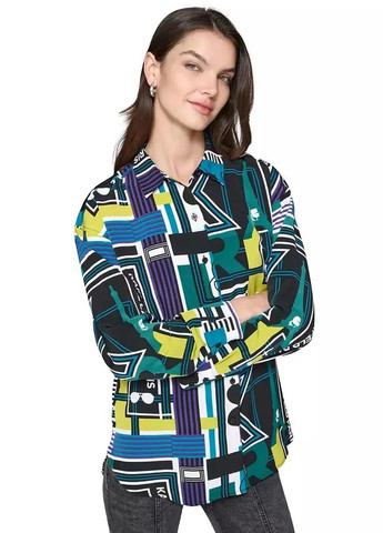 Женская рубашка Karl Lagerfeld. Стильная рубашка от Karl Lagerfeld   Легкая атласная ткань. Рубашечный воротник. Длинные рукава с манжетами на пуговицах.  Застежка на пуговицы спереди. Закругленный подол. Геометрический принт по всей поверхности рубашки. Отличное качество.