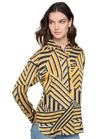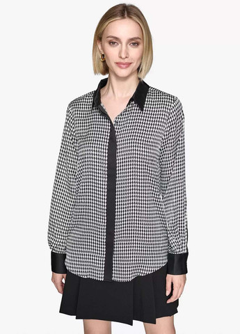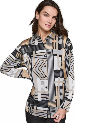Женская рубашка Karl Lagerfeld. Стильная рубашка с геометрическим принтом и с логотипом бренда. Легкая атласная ткань. Рубашечный воротник. Короткие рукава на шнурке-утяжке.  Застежка на пуговицы спереди. Отличное качество.