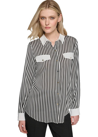 Женская рубашка Karl Lagerfeld. Стильная рубашка от Karl Lagerfeld   Легкая атласная ткань. Рубашечный воротник. Декоративные клапаны с пуговицами на груди. Длинные рукава с манжетами на пуговицах.  З астежка на пуговицы спереди. Закругленный подол. Полосатый принт по всей поверхности рубашки. Отличное качество.