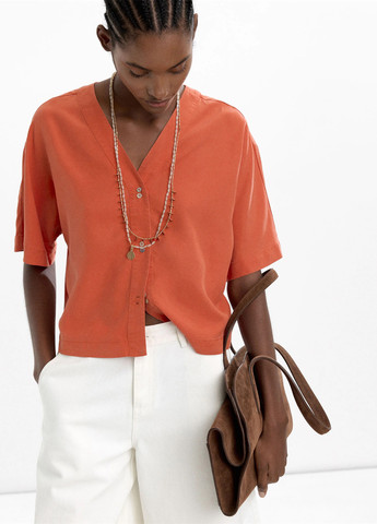 Рубашка из тонкой блестящей мягкой саржи. С воротником, планкой на пуговицах и манжетами на пуговицах. Широкие завязки с одной стороны и округлый край. Эту блузку можно носить как во время беременности, так и в период кормления грудью.