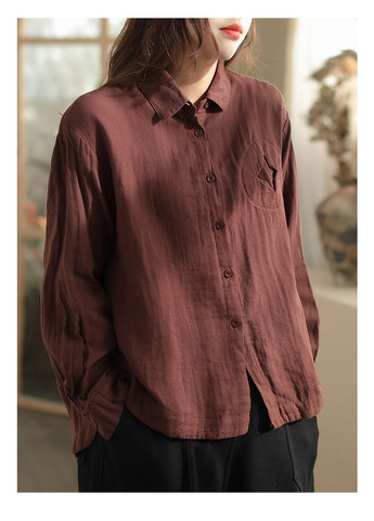 Модель имеет свободный крой, что обеспечивает комфорт и непринужденный силуэт. Застежка на пуговицы придает классический вид, позволяя регулировать глубину выреза. Спереди расположен накладной карман, который подчеркивает лаконичность дизайна и придает практичности. Рукава рубашки подвернуты, что придает образу легкой небрежности и стильного акцента.
