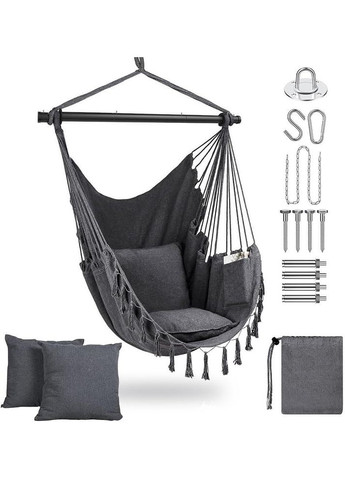 Наслаждайтесь полным комфортом с подвесным креслом-качалкой Vcumter, подходящим как для детей, так и взрослых. Изготовленное из прочной поли-хлопковой ткани, кресло выдерживает до 150 кг и имеет увеличенное посадочное место — подходит для отдыха в одиночку или вдвоём. Благодаря боковому карману для книги или телефона, вы можете с комфортом читать или расслабляться. В комплект входят 2 мягкие подушки, сумка для хранения и набор для крепления. Предназначено для использования в помещении и на улице, это кресло смотрится в спальне, гостиной, на террасе или в саду. Мобильное, удобное и легко стираемое, это кресло станет вашим любимым местом для отдыха дома или в путешествии. Характеристики товара: Бренд: Vcumter Цвет: Тёмно-серый Размеры: 150 x 120 см Вес: 3.5 кг Максимальная нагрузка: 150 кг Материал: Поли-хлопок Место использования: В помещении и на улице Комплектация: Кресло, подушки (2 шт), сумка, крепления, жердь Дополнительно: Боковой карман для книги или телефона Назначение: Для дома, террасы, сада, поездок Преимущества товара: Просторное посадочное место для максимального комфорта Современный дизайн, подходящий под любой интерьер Надёжная конструкция выдерживает до 150 кг Универсальное применение: дом, улица, кемпинг Лёгкая установка и удобная транспортировка Описание продукта