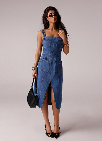Сарафан Livesso Vintage Washed Denim с круглым вырезом и расклешенным нижним краем. Выполнен из смеси денима с добавлением хлопка, вискозы и полиэстера. С карманами и застежкой-молнией.