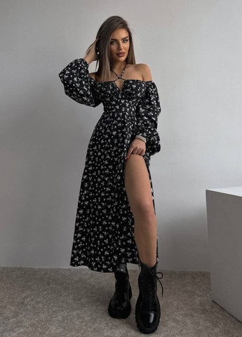Удлиненный сарафан на бретельках: на груди рабочие пуговицы, по бокам разрезы до колена, на груди и рукавах воланы.