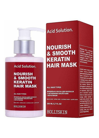 Питательная маска для волос Hollyskin Acid Solution Nourishing & Smooth Keratin Hair Mask разглаживает и смягчает волосы по всей длине, придает естественный блеск и объем, предотвращает ломкость, устраняет разрыхление и электризацию. Почему стоит купить: легко проникает в структуру волос, уплотняет и наполняет их, визуально утолщает волосы. разглаживает и уменьшает ломкость обеспечивает эффективное увлажнение, сохраняет упругость и эластичность волос. укрепляет волосы Нанести небольшое количество средства на влажные, слегка подсушенные полотенцем, волосы, подождать 5-10 минут и смыть достаточным количеством теплой воды.