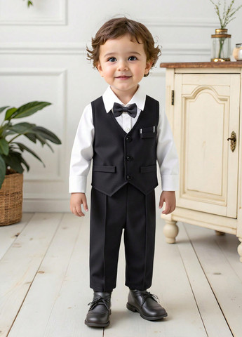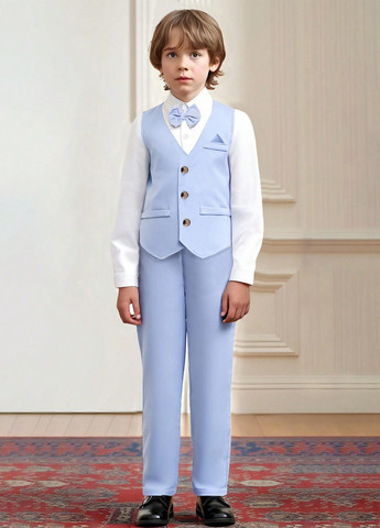 Этот элегантный костюм идеально подходит для мальчиков. Он состоит из пиджака, жилета, брюк и галстука-бабочки. Костюм с однотонным рисунком. Рекомендуется ручная стирка или профессиональная химчистка.