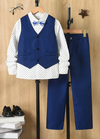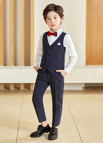 Комплект из трёх предметов SHEIN Tween Boy Gentleman. Этот комплект включает жилет, рубашку и длинные брюки. Они имеют классический крой.