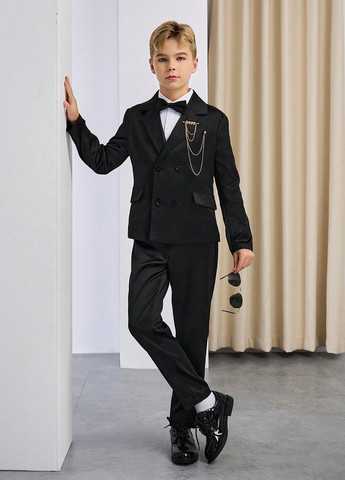 Этот комплект из пиджака и брюк для мальчиков SHEIN идеально подходит для особых случаев. Комплект имеет стандартный крой и застежку на пуговицы спереди. Он включает карманы и вырез с лацканами. Ткань слегка тянется для удобства и гибкости. Подходит для вечеринок, свадеб и праздников.