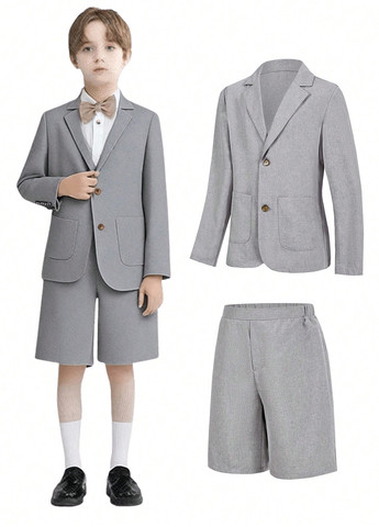 Этот комплект из 2 предметов включает пиджак и шорты для мальчиков-подростков. Подходит для школы, путешествий, официальных мероприятий и сезонной одежды. Дизайн предлагает свободный крой с пуговицами спереди и карманами. Он включает обычные рукава и изготовлен из неэластичной ткани.