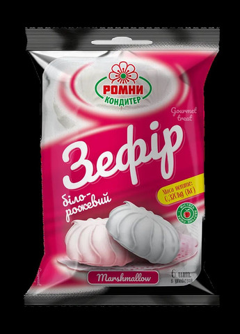 Зефир бело-розовый 320гр Ромны кондитер Легкий зефир на основе натурального яблочного пюре, яичного белка и пектина – натуральный сгуститель, полезный для здоровье человека.