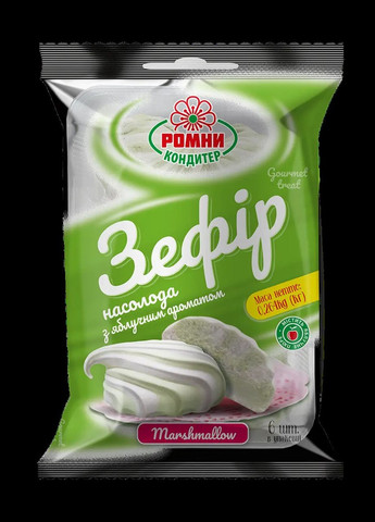 Зефир Наслаждение с ароматом яблока 264 гр Ромны кондитер Зефир Наслаждение с ароматом яблока обладает нежной воздушной консистенцией, изысканным вкусом и ароматом яблока. Данный зефир создан на основе яичного белка, пектина и с добавлением только натуральных красителей.