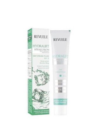 Антивозрастной дневной крем-флюид для лица Revuele Hydralift Hyaluron Day Cream Fluid SPF 15 50 мл Для комплексного ухода за кожей лица при появлении первых возрастных изменений современной представительнице женского пола стоит обратить внимание на дневной флюид Revuele Hydralift Hyaluron Day Cream Fluid SPF 15. Его формула обогащена концентрированной гиалуроновой кислотой и специальным солнцезащитным фильтром, которые эффективно нейтрализуют пагубное воздействие факторов окружающей среды. Косметический продукт восполняет недостаток влаги в эпидермисе и предотвращает процесс его дегидратации. Он заметно уменьшает выраженность морщин, устраняет следы усталости и осветляет пигментные пятна. Благодаря ускоренной реновации клеток и активизации процесса выработки коллагена, средство повышает упругость кожного покрова в несколько раз. Оно эффективно укрепляет ослабленные участки лица и хорошо регенерирует его поврежденные клетки. Способ применения: каждое утро наносить мягкими массирующими движениями на очищенную кожу лица и шеи, избегая области вокруг глаз. Объем: 50 мл