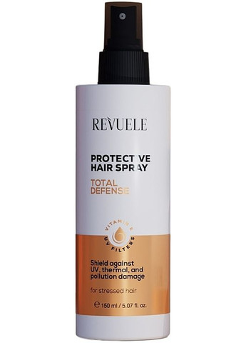 ОТ ЗАПАДА ДО ВОСТОКА СОЛНЦА - ЗАЩИТА ТВОИХ ВОЛОС НА КАЖДОМ ШАГЕ Так же, как УФ-лучи влияют на кожу, они также могут влиять на здоровье ваших волос. Защитите волосы от ежедневного повреждения, сухости и ломкости, интегрировав солнцезащитный уход премиум-класса в свой ежедневный уход за волосами. Наша коллекция TOTAL DEFENSE олицетворяет опыт REVUELE в защите волос от ультрафиолетового излучения, разработанный, чтобы защитить ваши волосы от ежедневного солнца и летних элементов, способствующих ломкости, сухости и тусклому виду. Наши продукты, наполненные репаративным витамином Е и усовершенствованными УФ-фильтрами, обеспечивают превосходный уход за солнцем и после загара, чтобы уменьшить последствия воздействия солнца, загрязнения и термического повреждения. Блокируют вредное воздействие УФ-лучей, уменьшают ломкость и поддерживают оптимальные здоровые волосы. REVUELE TOTAL DEFENCE PROTECTIVE HAIR SPRAY для поврежденных волос Ежедневный несмываемый кондиционер для защиты поврежденных волос укрепляет и восстанавливает их. Спрей действует как щит от внешних агрессоров окружающей среды, таких как загрязнение, УФ-лучи и другие факторы, которые уменьшают цвет волос и повреждают его. Этот ежедневный спрей для волос, обогащенный витамином Е, сделает волосы более мягкими и послушными.