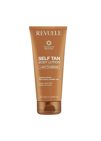 Автозагар для тела от среднего до темного Revuele Salf Tan Body Lotion Light To Medium с экстрактом алоэ и витамином Е Лосьон-автозагар от производителя косметики Revuele придаст вашей коже безупречный вид поцелуя солнца без солнечных лучей всего за несколько часов и сохранит эффект на долгие дни. Он создает приятный бронзовый оттенок от легкой до средней степени загара. Лосьон для тела имеет легкую текстуру, равномерно наносится, быстро впитывается. Вы получаете гладкий равномерный загар, без пятен и разводов. Средство для автозагара содержит алоэ и витамин Е, которые делают кожу мягкой и гладкой. Способ использования: Вымойте кожу и примените отшелушивающий скраб для тела. Особое внимание уделите сухим участкам – коленям, локтям. Нанесите крем на кожу тела, равномерно распределите по верхним и дайте ему впитаться – 5-7 минут. Вы можете смешать лосьон-автозагар с увлажняющим кремом для тела, чтобы получить более натуральный эффект. Через несколько часов вы увидите, как кожа изменяет оттенок. В ближайшие 8 часов не принимайте водные процедуры. Используйте лосьон-автозагар 2-3 раза в неделю. После использования тщательно промойте руки водой. Внимание: Перед первым использованием проверьте кожу на чувствительность к ней. Избегайте контакта с глазами. При попадании средства в глаза немедленно тщательно промыть водой. Не содержит SPF и защищает от ультрафиолетового излучения. Объем: 200 мл.