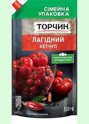 Кетчуп Торчин® Кроткий — самый популярный кетчуп среди украинцев, имеющий нежную томатную основу с любимыми специями (гвоздикой, корицей, мускатным орехом, лавровым листом) и мягкую густую текстуру. Кетчуп Торчин® Кроткий дополняет любой гарнир (спагетти, гречку, картофель) и мясо, а также идеально подходит к горячим бутербродам. Добавьте кетчуп Торчин® Кроткий к рагу, голубцам, или овощной запекане, и он придаст блюду насыщенный томатный вкус и восхитительный аромат специй и трав. Может содержать яичные продукты, глютен, молоко, горчицу на сою. Вода питьевая, томатная паста (30%), сахар, уксус спиртовый, соль поваренная, специи молотые сушеные (0.04%) (корица, гвоздика, мускатный орех), экстракт лаврового листа (0.002%).