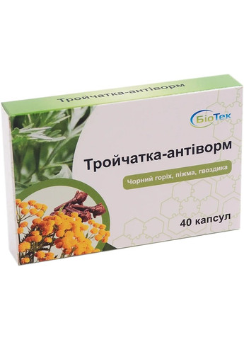 Капсулы "Тройчатка-антиворм" – дополнительный источник веществ, способствующих очищению организма от паразитов и глистов. Специально разработанный комплекс из экстрактов трав, создающий неблагоприятные условия для паразитов и глистов. Травяные горечи, заключенные в капсуле, обладают мягким желчегонным и сокогонным действием, что способствует выведению из организма паразитов. Антипаразитарное и противоглистное очищение необходимо всем, кто страдает хроническими заболеваниями внутренних органов и кожи, имеющих избыточную или недостаточную массу тела, предъявляющую жалобы на быструю утомляемость, головную боль, снижение уровня гемоглобина, нарушение сна, расстройства стула, выпадение волос. 1 капсула содержит экстракт кожи черного ореха 200 mg (мг); порошок гвоздики 50мг(мг); экстракт корня имбиря 30 mg (мг); порошок пижмы 60 mg (мг); экстракт горной полины 30 mg (мг). Вспомогательные вещества: лактоза 65mg(мг), МКЦ-101 60mg(мг), стеарат кальция.