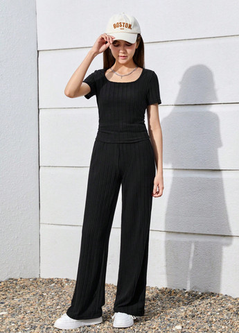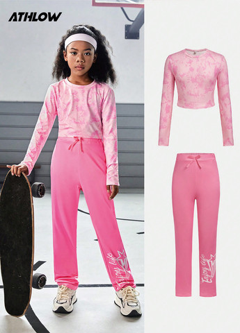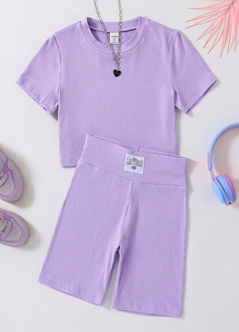 Комплект спортивной одежды для девочек, фиолетовый, из 2 предметов. Этот комплект спортивной одежды включает в себя фиолетовый топ с короткими рукавами и шорты в тон. Комплект выполнен из приятного к телу эластичного материала. Круглый вырез горловины и стандартный подол. Шорты на резинке. Только ручная стирка.