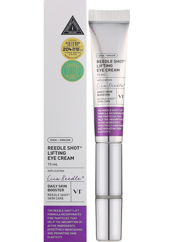 VT PDRN Reedle Shot Eye Lifter — это высокоэффективный крем для области вокруг глаз с технологией CicaReedle™, основанной на микрошипах из кремния и молекуле PDRN (ДНК лосося). Средство направлено на омоложение, восстановление и укрепление тонкой кожи век. Благодаря капсулам з активными компонентами, крем стимулирует обновление клеток, разглаживает морщины, уменьшает отёчность и осветляет тёмные круги. Активные ингредиенты: PDRN (Sodium DNA) — омоложение и регенерация на клеточном уровне Гиалуроновая кислота в 10 формах — глубинное увлажнение Пептиды и полипептиды (в т.ч. Copper Tripeptide-1, Palmitoyl Pentapeptide-4) — уплотнение кожи и борьба с морщинами Комплекс церамидов, холестерин, фитосфингозин — восстановление липидного барьера Ниацинамид, аденозин, глутатион — выравнивание тона, укрепление и улучшение микроциркуляции Экстракты центеллы, женьшеня, прополиса, коллаген, эластин — антивозрастной и укрепляющий уход Крем обладает легкой текстурой с эффектом мягкого покалывания, что улучшает проникновение активов и делает уход более эффективным. Подходит для ежедневного использования. Преимущества: Разглаживание мимических и возрастных морщин Увлажнение и питание нежной кожи век Осветление и лифтинг-эффект Снятие отёков и признаков усталости Способ применения: Наносите небольшое количество крема на очищенную кожу вокруг глаз, аккуратно вбивая подушечками пальцев до полного впитывания. Используйте утром и вечером. Избегайте попадания в глаза. Объём: 20 мл