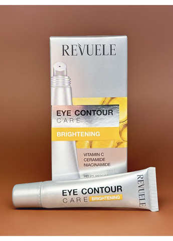 REVUELE Eye Contour Care Brightening. Инновационное решение для борьбы с темными кругами, оживляющее общий вид области вокруг глаз. Активная формула с витамином C, видимо, осветляет и оживляет кожу, восстанавливая естественный сияющий вид. Ниацинамид глубоко увлажняет и способствует равномерному тону кожи, придавая молодой вид. Церамид восстанавливает барьер влаги кожи, обеспечивая ее питание и защиту. Инструкции: Наносите на чистую и сухую кожу вокруг глаз. Используйте утром и вечером. Осторожно: возможна индивидуальная непереносимость любых ингредиентов. Избегайте контакта с глазами. При попадании продукта в глаза немедленно промойте их большим количеством воды.