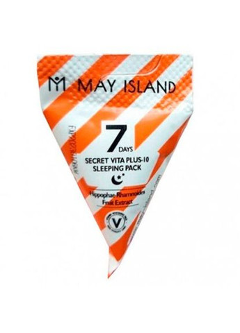 Ночная маска осветительная May Island 7 Days Secret Vita Plus-10 Sleeping Pack, 5 г Маска с высоким содержанием витаминов и мощными антиоксидантами для ночного ухода за кожей лица. Обладает отличным омолаживающим эффектом, активизирует процесс регенерации клеток кожи. Подходит для любого типа кожи, особенно рекомендуется для усталой, тусклой, пигментированной, а также для кожи с возрастными изменениями и раздраженной. Средство находится в индивидуальных саше-пирамидках, одной пирамидки хватает на 2-3 применения. Свойства: увлажняет, осветляет, питает кожу, снижает чувствительность кожи, уменьшает отеки, оказывает сосудоукрепляющее действие и уменьшает купероз, способствует освещению пигментации различного происхождения (поставок, веснушки и т.п.), защищает от отрицательных внешних воздействий. Перед сном на очищенную кожу заранее нанести маску тонким слоем, распределить легкими массирующими движениями, оставить на всю ночь.