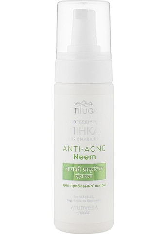 В последнее время косметологи все чаще обращают свое внимание на нее, поскольку это растение обладает множеством полезных свойств. Она хорошо увлажняет и восстанавливает кожный покров, повышает его упругость, эффективно борется с высыпаниями и жирным блеском. Специалисты бренда Triuga использовали экстракт нима для создания аюрведической пенки для умывания проблемной кожи лица. Этот косметический продукт деликатно очищает, нейтрализуя раздражение и предотвращая воспалительные процессы. Особенности Triuga Ayurveda Mix Anti-Acne Neem Foam: - предназначен для очищения проблемной кожи, склонной к акне; - обеспечивает нежную и эффективную очистку лица, шеи, области вокруг глаз от грязи, пыли, токсинов, себума и декоративной косметики; - восстанавливает гидролипидный баланс и микрофлору эпидермиса, поддерживает здоровый Рh; - уничтожает бактерии, провоцирующие воспалительные процессы; - замедляет сек кожу; - дарит ощущение свежести и комфорта; - не сушит; - подходит для смывания макияжа с глаз, не раздражает слизистые.