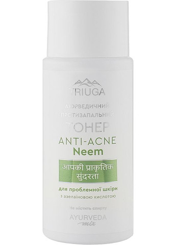Аюрведический противовоспалительный тонер для проблемной кожи лица от бренда Triuga – результат совместной работы косметолога, дерматолога, технолога и специалиста по аюрведе. Он быстро восстанавливает микрофлору кожи, нормализует ее уровень Рh, уничтожает бактерии, провоцирующие воспалительные процессы. Продукт также интенсивно питает и увлажняет кожу, поддерживая свежесть, гладкость и ухоженный вид. Особенности Triuga Ayurveda Mix Anti-Acne Neem Toner: - рекомендован для ухода за проблемной кожей, склонной к акне; - регулирует работу сальных желез, снижая выработку себума и предотвращая жирный блеск лица; сужает поры; выравнивает тон лица, обесцвечивает и освещает постакне; дарит ощущение свежести, чистоты и комфорта; можно использовать для кожи лица, спины, рук и декольте; не сушит кожный покров; не содержит спирта.