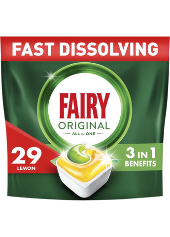 FAIRY Original All in One Капсулы для посудомоечной машины с ароматом лимона 29 шт 🍋✨ Идеальная чистота без труда! 🧼 Капсулы Fairy Original All in One обеспечивают блестящий результат даже для самых сложных загрязнений, даря посуде свежий лимонный аромат. ✅ Формула 3 в 1 – очищает, придает блеск и защищает посудомоечную машину. ✅ Мощное удаление жира даже в коротких циклах ✅ Защита стекла от помутнения – посуда всегда выглядит как новая ✅ Удобная упаковка 29 капсул – готовые дозы без лишних затрат 💡 Просто положите капсулу в посудомоечную машину и наслаждайтесь безупречной чистотой и свежестью лимона 🍋 С Fairy Original All in One мойка посуды становится максимально простой и эффективной! 🌟
