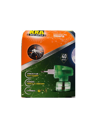 KRA DEO Жидкость от комаров Время защитного действия: 1 флакон до 40 ночей. Начало действия жидкости – через 10-15 минут после включения, полное уничтожение комаров – через 20-30 минут. Действующее вещество: Трансфлутрин 1%, бутилгидрокситолуол Защищает от укусов комаров, москитов, мокрецов. Оптимально работает в помещениях площадью до 30 кв.