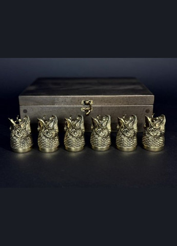 Стопки бронзовые перевертыши Люкс Nb Art Щука 6 шт 30 мл 48440027 в деревянном кейсе из бука 1. Рюмка Щука: художественное литье из бронзы, внутри покрытые пищевым булатом. Высота 70 мм, ширина 40 мм, объем 30 мл, вес 220 грамм. 2. Подарочный кейс: материал коробки – дерево бук. Все рюмки ставятся на голову!
