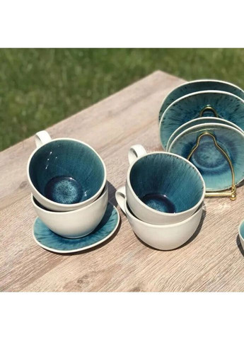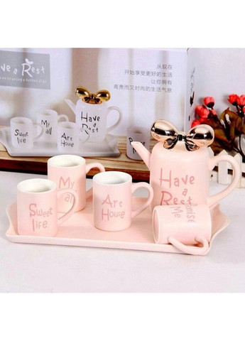 В набор входит 4 кружек , 1 поднос и 1 заварочный чайник.
