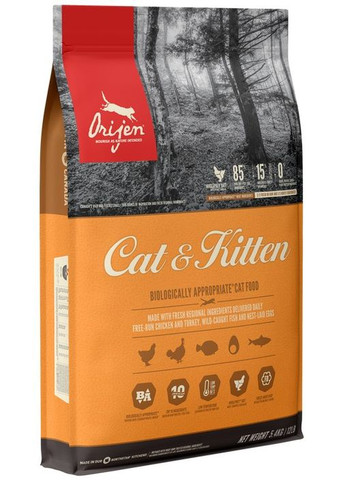 Полноценный корм для кошек и котят всех пород. Корма ORIJEN содержат 40% высокопитательных белков и ограниченное количество (19%) низкогликемических углеводов, что обеспечивает кошкам и котятам рацион, соответствующий их эволюционным и биологическим потребностям. Не имеющий аналогов среди других кормов для кошек или котят, корм ORIJEN на 2/3 состоит из СВЕЖЕГО (охлаждённого, без консервантов) или СЫРОГО (быстрозамороженного, без консервантов) мяса, которое составляет первые 10 ингредиентов. 1/3 свежего мяса цыплят и индейки, а также рыбы бережно высушивается при 90°С для обеспечения корма концентрированным источником высокопитательного белка, который не может быть получен за счёт одного лишь свежего мяса. Богатые питательными веществами ингредиенты в соотношении WholePrey™ включают свежее мышечное мясо, внутренности и хрящи, а также цельную рыбу и яйца, являясь источником практических всех питательных веществ, в которых нуждается ваша кошка или котёнок. Добавление бережно сублимированной печени служит естественным усилителем запаха и вкуса корма ORIJEN, что превращает его в деликатес даже для привередливых кошек. Норма кормления Orijen Cat&Kitten Cat Ингредиенты Свежее мясо цыпленка (18%), свежее мясо индейки (7%), свежие цельные яйца (5%), свежая печень цыпленка (5%), свежая цельная камбала (4%), свежая цельная сельдь (4%), свежая печень индейки (4%), свежее сердце цыпленка (4%), свежее сердце индейки (4%), свежие шеи цыпленка (4%), цыпленок дегидратированный (4%), индейка дегидратированная (4%), цельная скумбрия дегидратированная (4%), цельная сардина дегидратированная (4%), цельная сельдь дегидратированная (4%), куриный жир (3%), красная чечевица, зеленый горошек, зеленая чечевица, нут, желтый горошек, клетчатка из чечевицы, фасоль, цельные флотские бобы, куриные хрящи дегидратированные (1%), жир сельди (1%), печень цыпленка сублимированная, печень индейки сублимированная, свежая столовая тыква, свежая мускатная тыква, свежий цукини, свежий пастернак, свежая морковь, свежие яблоки, свежие груши, свежая листовая капуста, свежий шпинат, свежие листья свеклы, свежая зелень репы, бурая водоросль, цельная клюква, цельная черника, цельные ягоды ирги ольхолистной, корень цикория, куркума, расторопша, корень лопуха большого, цветы лаванды, корень алтея, плоды шиповника. Добавки Холина хлорид 1200 мг, хелат цинка 100 мг, хелат меди 11 мг, сухой продукт ферментации Enterococcus faecium. Калорийность 4160 ккал/кг (540 ккал на стакан объёмом 250 мл/120 г), при этом 39% калорий организм получает из белка, 18% — из фруктов и овощей и 43% — из жира.